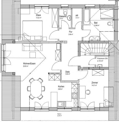 Essecke besitzt einen grosszügigen Tisch, an dem 4